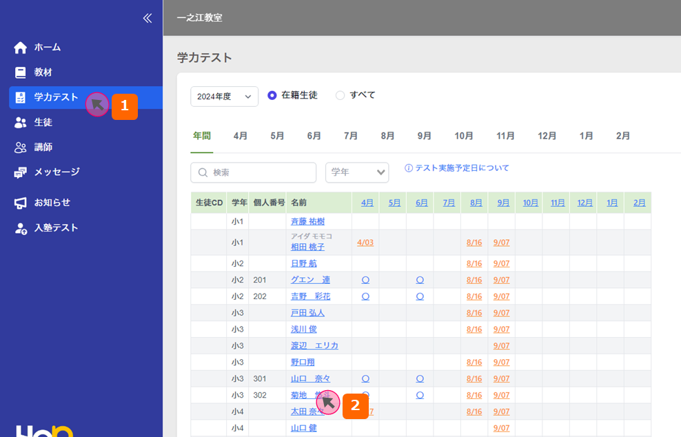 2.一覧の中から生徒の氏名をクリックすると、生徒の学力テスト年間成績を確認することができます。