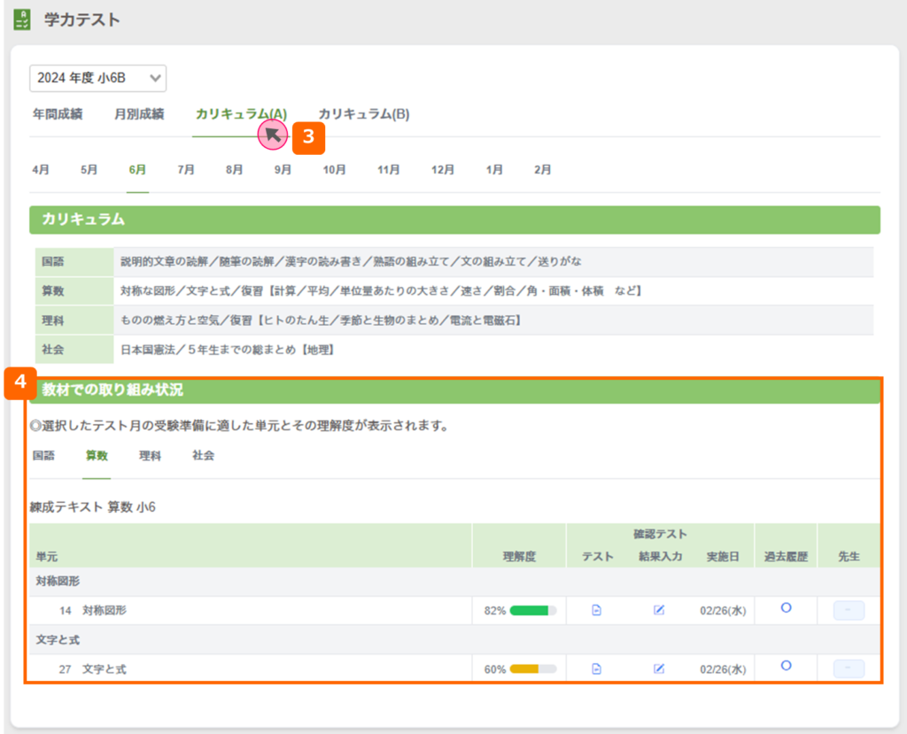 4.教材をご利用いただいている場合、テストカリキュラムに対応した教材の取組状況を確認できます。