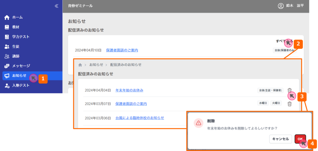 お知らせを削除すると、生徒・保護者のお知らせ画面にも表示されなくなります。