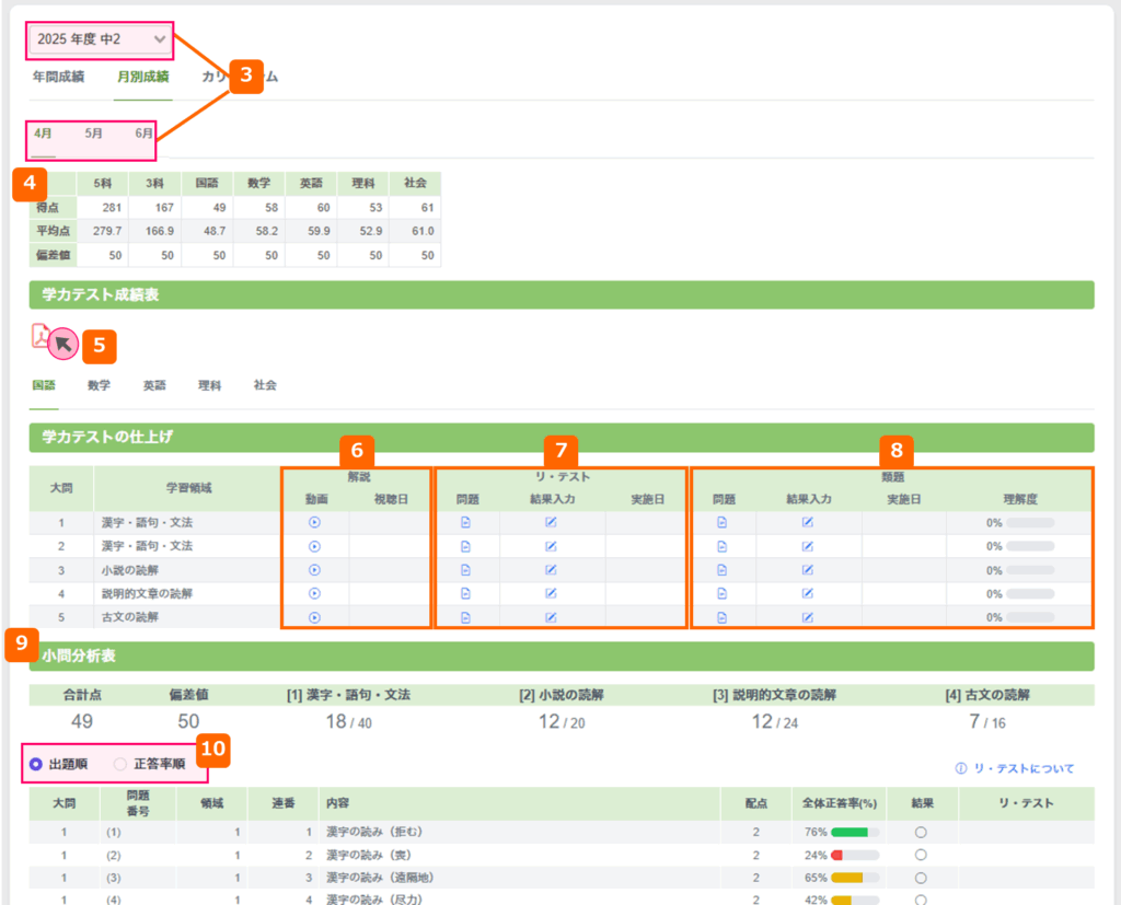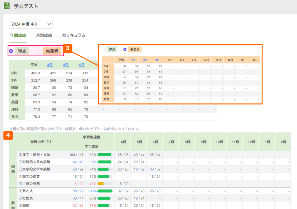3.成績一覧は、「得点」か「偏差値」で表示を切り替えることが可能です。