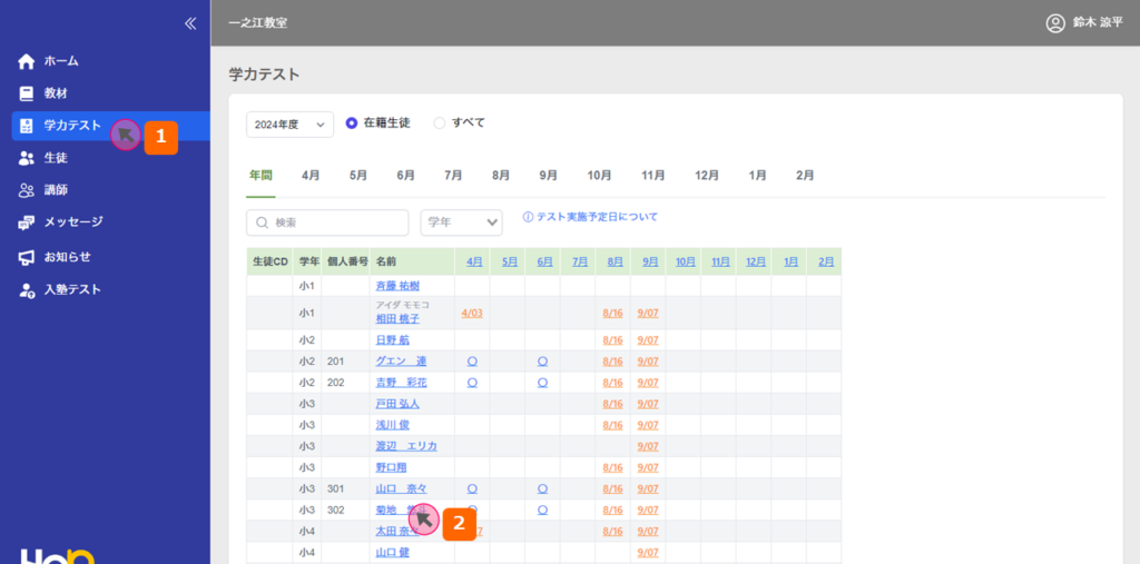 2.一覧の中から生徒の氏名をクリックすると、生徒の学力テスト年間成績を確認することができます。