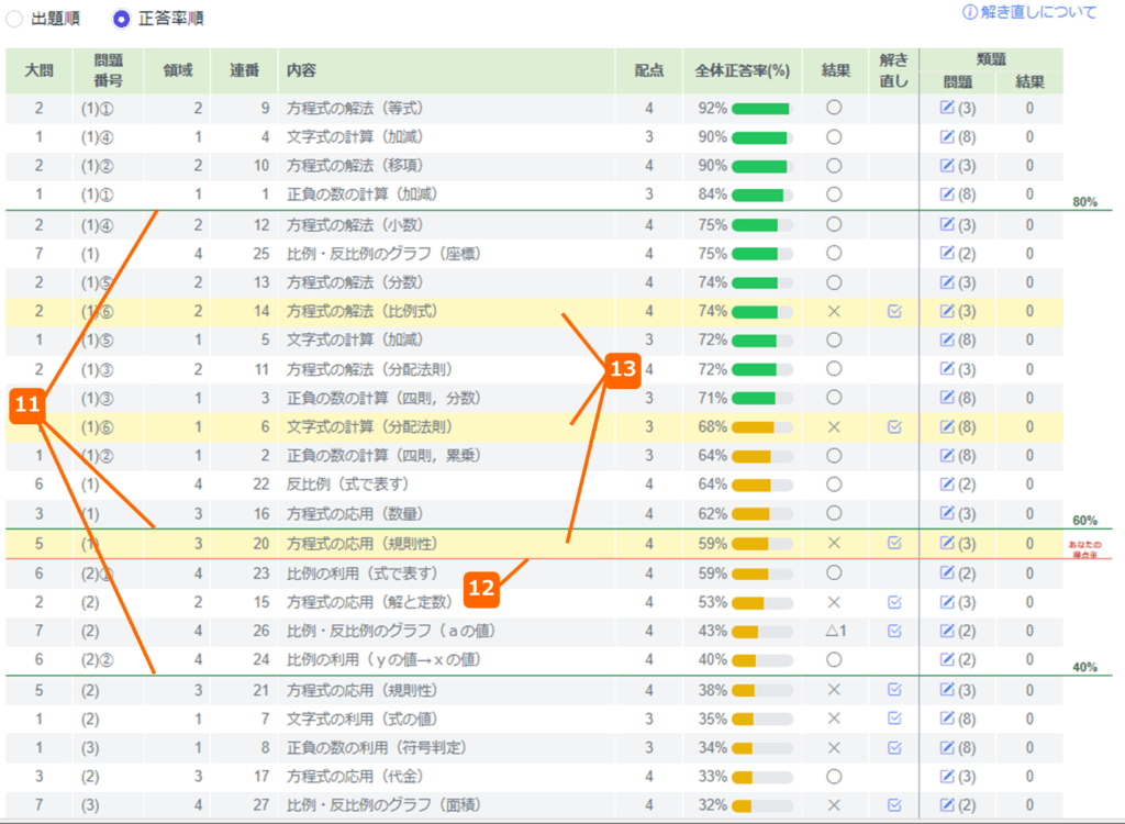 また、到達度の%で色分けされているので、得意・苦手分野がひと目でわかります。