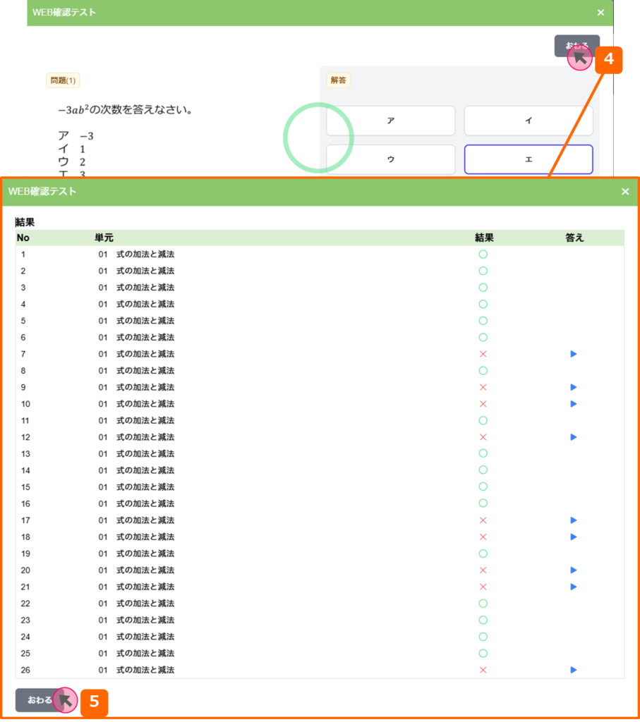 1.教材画面の「WEB確認テスト」の列にあるアイコンを押すと、