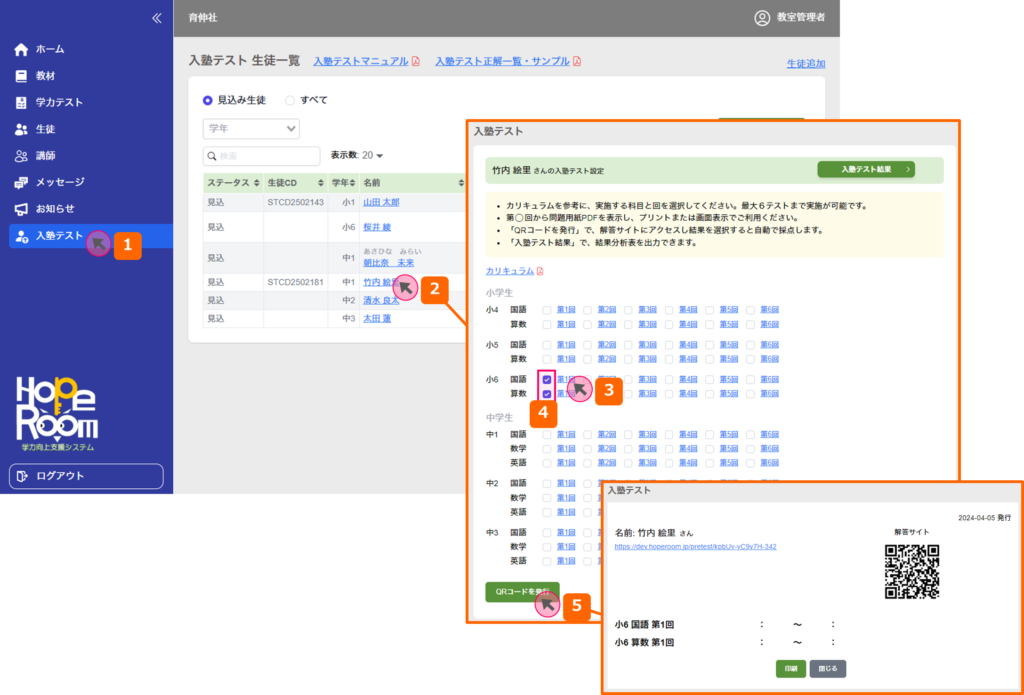 小学4~6年生は国・算、中学生は国・数・英の問題を用意しており、一人の生徒につき、最大6テストまで実施が可能です 。