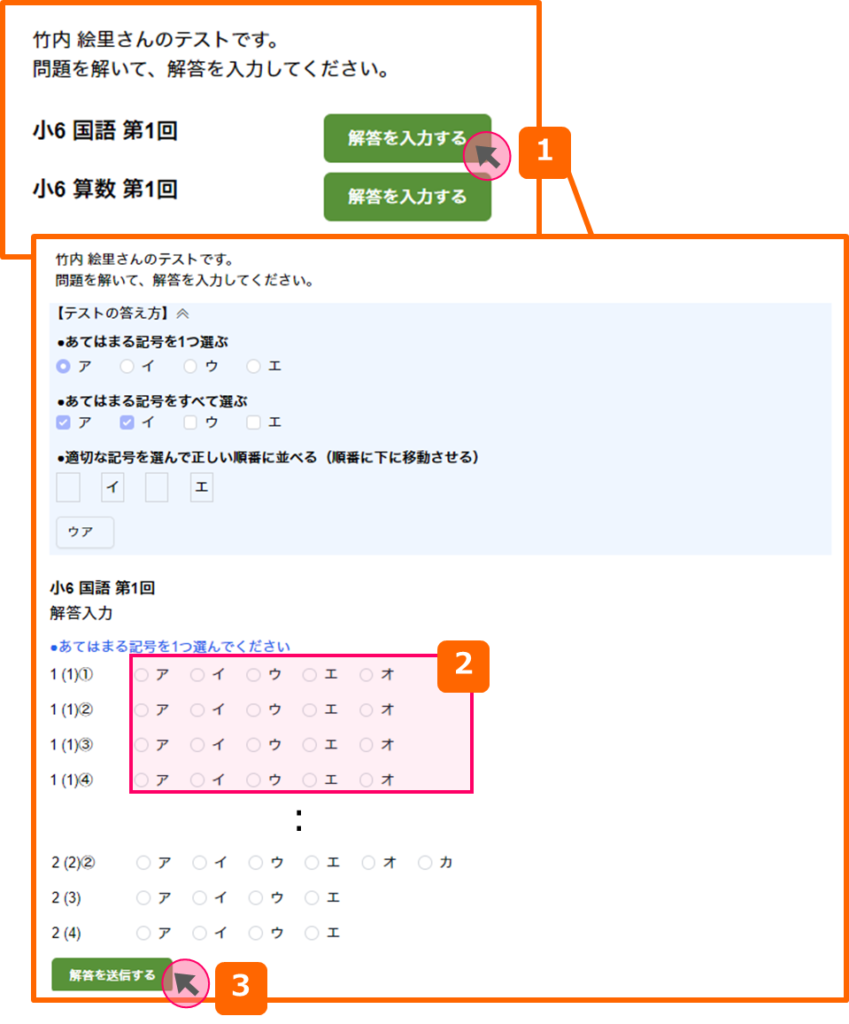1.「解答を入力する」を押して各テストの解答入力画面に行き、生徒は画面上で解答を入力します。