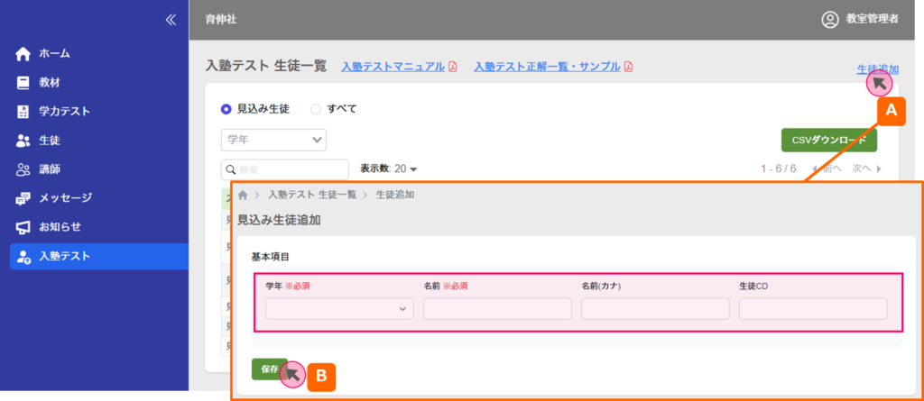 B.学年・名前・名前(カナ)・生徒CDを入力し、保存ボタンを押すとステータスが「見込」の生徒が追加されます。
