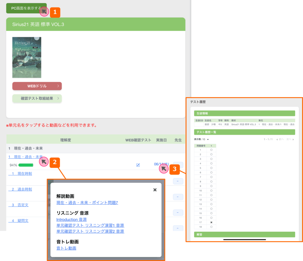 2.解説動画やリスニング音源などのコンテンツがある場合、単元名がリンクになっており