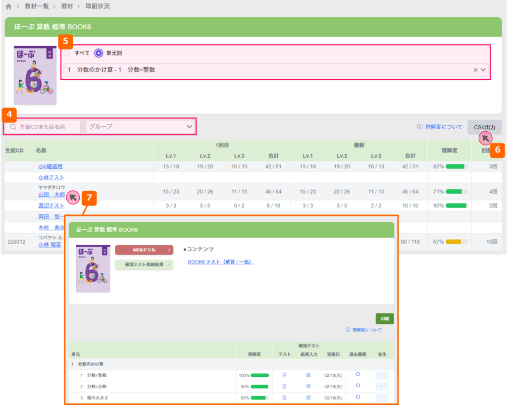 7.生徒氏名をクリックすると、その生徒の詳細な取組結果一覧を表示できます。