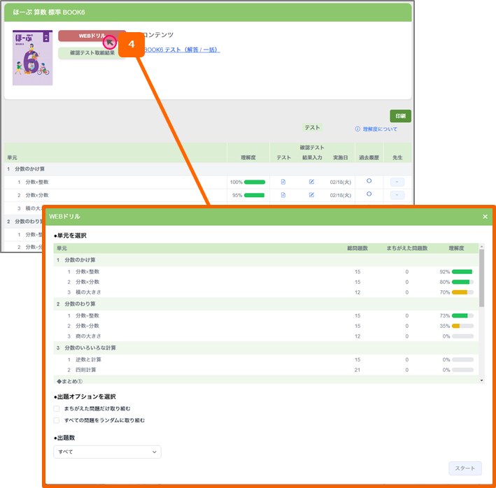 WEBドリル画面にある「理解度」は、WEB確認テストの情報になります。