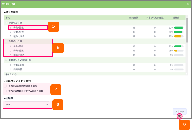 「まちがえた問題だけ取り組む」にチェックを入れると、選択した単元のまちがえた問題のみが順番通りに出題されます。